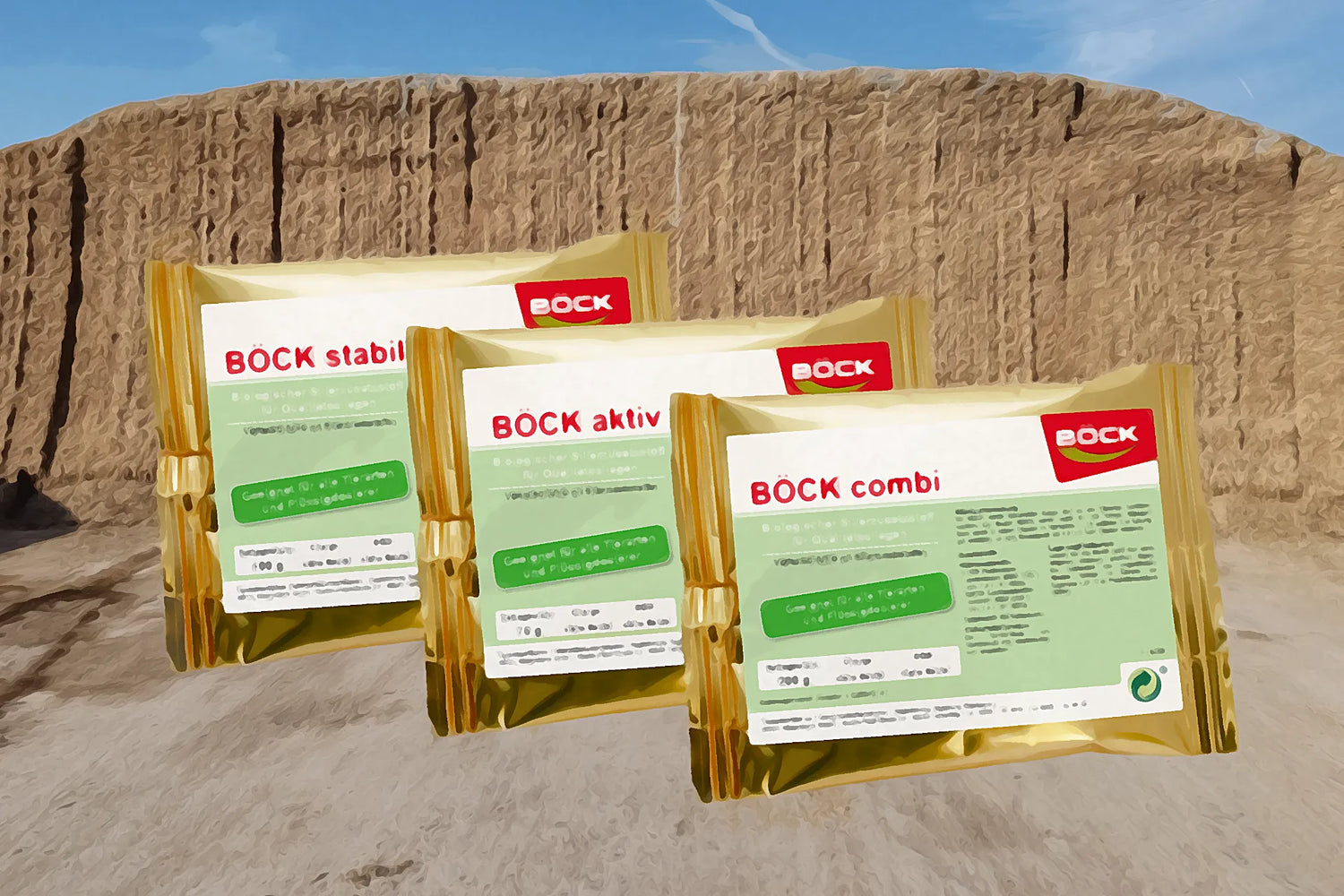 In der Kategorie Siliermittel finden Sie Premium-Lösungen von BÖCK für optimale Fermentation und gesteigerte Silagequalität: Vom vielseitigen BÖCK combi für höhere Trockenmasse über BÖCK aktiv für nasse Silage bis zum BÖCK stabil gegen Nacherwärmung – mit bis zu 300.000 KBE/g Wirkstoffkonzentration für nachweislich bessere Nährstofferhaltung und Tiergesundheit.